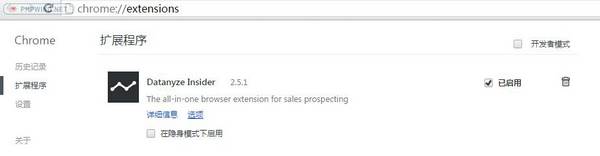 首先,我们要有一个谷歌浏览器,进入它的扩展程序。我们安装一个扩展程序,它的名字叫Datanyze Insider,如下图所示: